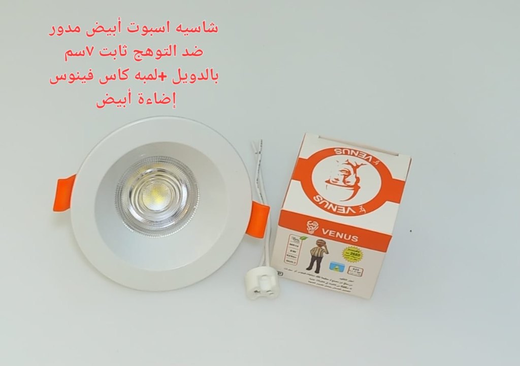 شاسيه اسبوت ابيض مدور ضد التوهج ثابت 7 سم بالدويل+ لمبه كأس فينوس اضاءة ابيض