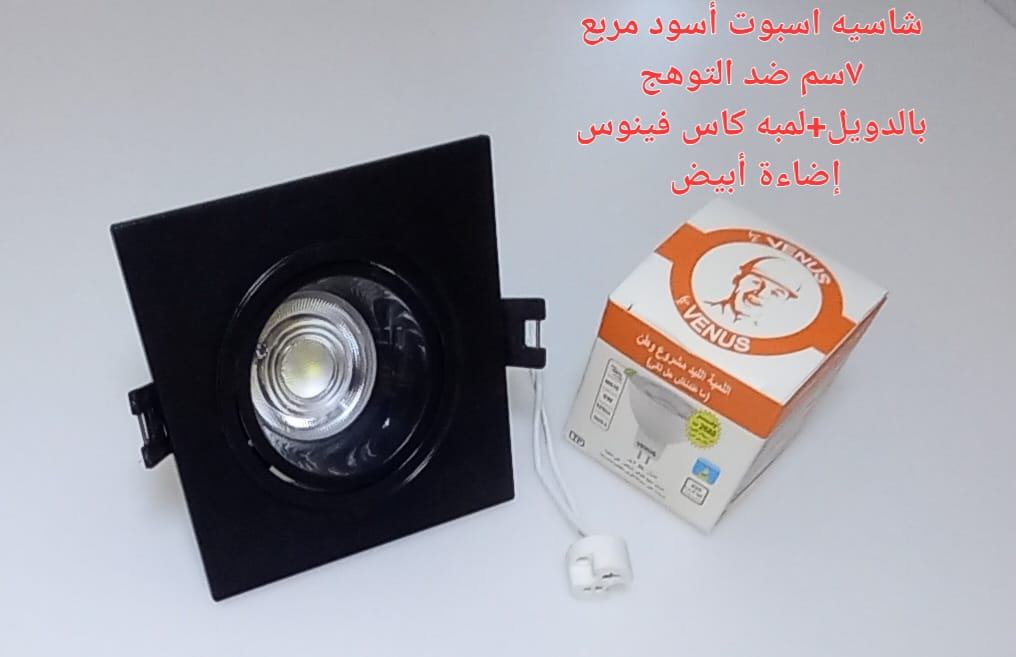 كمية شاسيه اسبوت اسود مربع 7 سم ضد التوهج بالدويل + لمبه كأس فينوس اضاءة ابيض